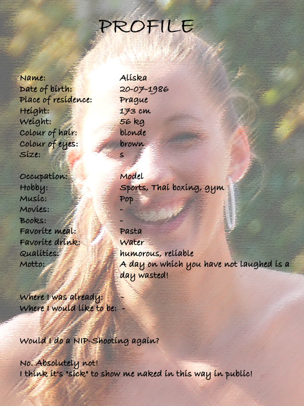 Zur zweiten Serie fuhren wir an die Moldau wobei mir Aliska sagte dass sie das Shooting lieber da machen möchte wo weniger Leute sind. Wir starteten und nach ein paar Minuten kam wieder die gleiche Frau aus dem Park und sagte das sie die Polizei rufen würde und das was wir machen verboten ist. Aliska wollte jetzt nur noch fertig werden. Sie hatte absolut keinen Spass mehr und meinte das sie das Shooting beenden möchte. Wir hörten dann auch nach wenigen Minuten auf und ich versuchte sie zu überreden an einer anderen Location das Shooting weiter zu machen. Aber das alles half nichts. Sie meinte nur dass es in ihren Augen doch total dumm sei, nackt in der Stadt zu laufen und das sie so etwas nie wieder machen würde. Wir trennten uns dann von Aliska und sind zu zwei anderen Modellen gefahren mit denen wir beide ein richtig gutes Shooting in Prag hatten…….davon verrate ich jetzt aber erstmal nichts. 🙂