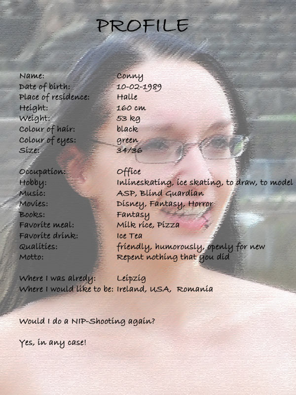 Als wir Conny in Leipzig trafen, machte uns das Wetter einen Strich durch die Rechnung: Wind und Nieselregen! So tranken wir an diesem Tag einen Kaffe zusammen und konnten mit Conny den Shootingaublauf besprechen. Wir plauderten über alles mögliche. Conny war zur Zeit Arbeitslos und wollte sich mit dem Shooting etwas Geld verdienen. Sie wäre sogar an diesem Tag im Regen gelaufen – aber das wollten wir ihr nicht zumuten. Es war ihr erstes NIP-Shooting und sie hatte jede Menge Fragen und Vorschläge (z.B. was sie für Schuhe tragen soll, ob sie verschiedene Accessoires mitbringen soll, usw.).