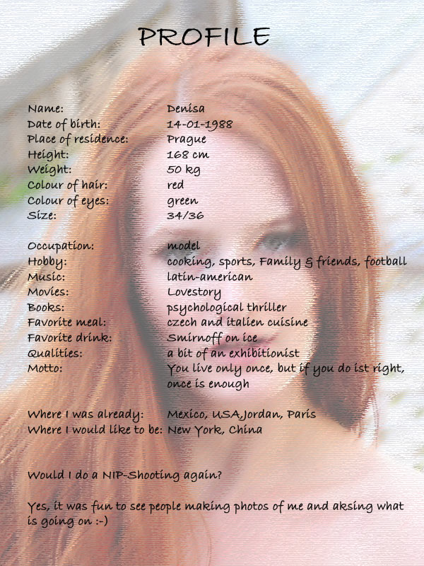 Denisa erreichte uns mit etwas Verspätung und einem Stadtplan in ihrer Hand vor unserem Hotel in Prag. Sie entschuldigte sich tausend mal für ihre Verspätung; irgendwie hatte sie die falsche Straßenbahn erwischt und fand dann nicht den richtigen Weg zu unserem Treffpunkt. Auf den ersten Blick haben wir sie gar nicht erkannt – sie sah so anders aus wie erwartet. Das sollte sich aber auf der Autofahrt in die Innenstadt ändern. Ich weiss nicht wie sie es geschafft hatte, aber innerhalb von weniger Minuten war sie komplett neu und perfekt geschminkt und frisiert (und das bei holprigen Straßenverhältnissen!). Mit ihr kam man schnell ins Gespräch. So erzählte sie uns, dass sie hauptsächlich „Beauty & Fashion“ und „Aktaufnahmen“ macht. Dies war ihr erstes nude-in-public Shooting und sie war auf die Reaktionen der Passanten gespannt.