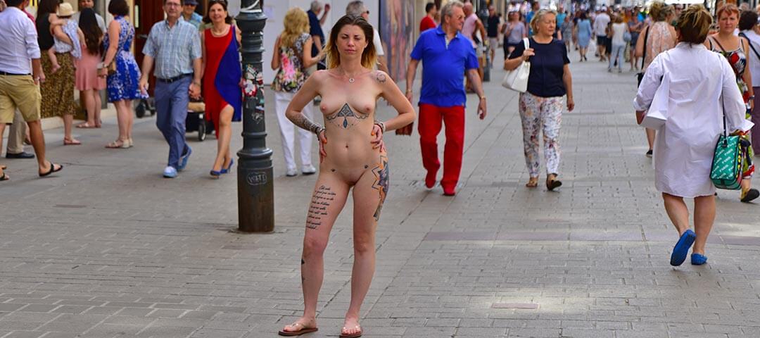Draco ist ja ein richtiger „NIP-Profi“. Sie hat schon ganz oft vor der Kamera gestanden und ist nackt nur die Straßen gelaufen, und da haben wir uns gedacht, dass wir vielleicht auch mal mit ihr ein Shooting machen sollen. Wir haben Draco gefragt und sie hat sich darüber sehr gefreut und uns sofort zugestimmt. Sie konnte sich auch eine Stadt aussuchen und da wollte sie unbedingt in Prag das Shooting machen. An dem Tag haben wir uns in der Innenstadt verabredet und sind gemeinsam zum Startpunkt spaziert. Wir besprachen noch ein paar Details, aber das war bei Draco eigentlich nicht notwendig. Sie wusste, um was es geht, und wollte endlich beginnen. Sie zog sich aus und spazierte los. Die Straßen waren schon etwas gefüllt und die Stimmung war auch sehr gut! Draco spazierte die Straße entlang und unterhielt sich mit einigen Passanten oder erzählte uns etwas über die Stadt. Wenn man Draco so entlang laufen sieht, möchte man meinen, dass es das Normalste auf der Welt ist und dass sie das wohl jeden Tag macht. Zwischendurch traf sie noch zwei Freundinnen, mit denen sie ein kurzes Gespräch hatte. Die fanden das wohl sehr lusting, Draco so nackt auf der Straße zu sehen. Nach knapp 30 Minuten hörten wir dann aber erstmal auf, um eine kurze Pause zu machen. Danach ging es da weiter, wo wir aufgehört haben. Es ging schön durch die Altstadt, an der bekannten Uhr vorbei, immer weiter in Richtung Karlsbrücke. Draco wollte unbedingt auch hin. Das war ihr großer Wunsch, einmal nackt darüber zu laufen. Gesagt getan, kaum waren wir mit der zweiten Serie fertig, ging es auf die Brücke. Die war wirklich gut besucht und es war richtig voll. Draco zog sich aus und spazierte los. Ein kurzer Plausch hier, ein Selfie da, Draco hatte jede Menge zu tun. Nach zehn Minuten hörten wir dann aber auch auf und beendeten einen super Tag mit Draco. Dass es nicht das letzte Shooting gewesen ist, sollte jedem klar sein. Ich glaube, Draco kann da nicht genug bekommen. 🙂