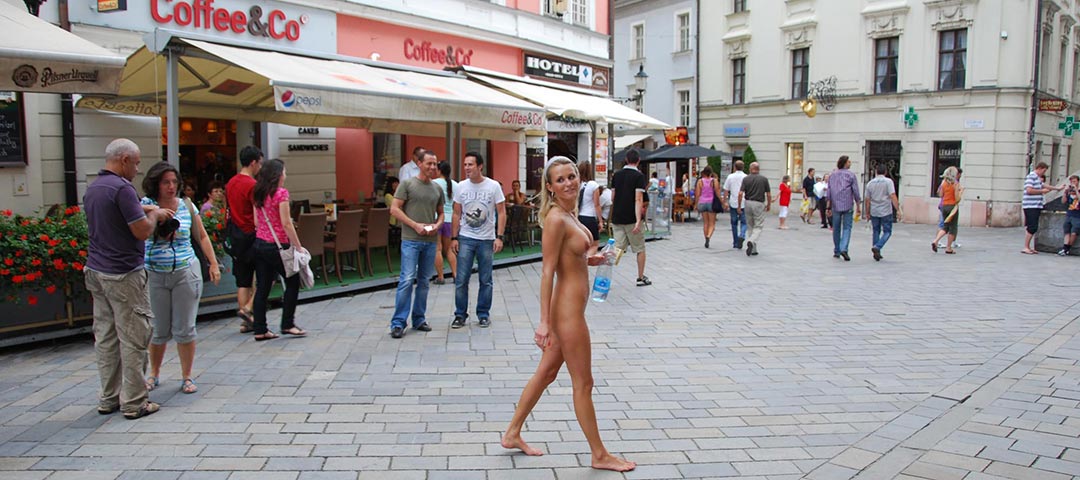 Elly ist ein Model aus Italien welches einen Freund von uns kontaktiert hat um mit uns ein Shooting zu machen. Normalerweise suchen wir ja immer nach Modellen, aber es ist auch mal schön wenn wir das nicht müssen und die Mädels zu uns kommen. Als Drehort haben wir uns für Bratislava entschieden weil Elly auch gerne dort was machen wollte. Wir starteten erstmal in der beliebtesten Gasse Bratislavas um zu schauen wie die Stimmung war. Sie war wie immer super und die Touristen reagierten durchweg positiv auf Elly. Da sie auch etwas älter war und ganz genau wusste was zu tun war, hatte sie natürlich auch keine Angst oder war nervös. Sie genoss das Shooting und liebte es im Mittelpunkt zu stehen. Genau deswegen hat sie uns ja im Vorfeld gefragt ob wir mit ihr einen Film drehen wollten. Auch als uns nach einigen Minuten die Polizei erwischte und aufforderte aufzuhören zeige Elly keine Angst uns wollte natürlich weiter machen. Wir gingen hoch zur Burg um es dort mal zu versuchen. Das Wetter passte allerdings gar nicht zu unserem italienischen Model, was der Stimmung aber nicht schadete. An der Burg angekommen, ging es direkt weiter und die Passanten konnten es absolut nicht glauben was sich vor ihren Augen abspielte. Das ganze wurde dann allerdings von einem Mitarbeiter des Wachdienstes unterbrochen der uns bat woanders hin zu gehen. Wir gingen nur ein paar Meter weiter und liefen die restlichen Minuten durch den Park wo aber auch hier einige Passanten waren. Irgendwie hatten wir an diesem Tag nicht das Glück auf unserer Seite. Trotz des Kontaktes mit der Polizei am Anfang des Shootings gingen wir noch einmal in die Altstadt und drehten dort eine kleine Runde um alle zufrieden zu stellen. Elly hatte sehr viel Spass und konnte das erste mal selbst nackt auf der Strasse laufen. Sie genoss es und beim späteren Essen hat sie uns auch verraten dass sie das unheimlich angemacht hat. Somit haben wir nicht nur die Passanten sondern auch das Model glücklich gemacht. 🙂