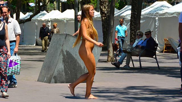 Mit Friederike und 3 weiteren Mädels sind wir nach Barcelona gefahren um da mal wieder ein paar schöne Tage zu verbringen und um coole Aufnahmen zu machen. Friederike wollte als erstes und somit startete sie an der Uferpromenade. Nach dem obligatorischen Interview ging es los. Da sie schon ähnliche Sachen gemacht hatte, viel es ihr auch nicht schwer für uns nackt in der Stadt vor der Kamera zu stehen. Sie zog sich aus und fühlte sich direkt wohl und die Passanten honorierten es mit positiven Feedback. Kaum waren aber ein paar Minuten rum kam eine Polizeistreife vorbei. Ob die jetzt extra wegen uns gerufen wurde wissen wir nicht, aber wir mussten trotzdem erst einmal aufhören. Wir überlegten kurz was wir machen sollen und entschlossen uns, nachdem die Polizei weg war, weiter zu filmen. Jetzt hatte Friederike die Idee ein weißes Tuch mit einem Spruch zu versehen um die Leute aufmerksam auf sich zu machen. Mit dem Tuch in der Hand ging sie jetzt zu vielen Leuten um mit ihnen darüber zu reden oder auch nur Fotos zu machen. Ganz viele Passanten kamen auch zu ihr weil sie den Spruch gut fanden und wollten diskutieren. Das ging dann richtig lange und wir bekamen viele gute Minuten.
