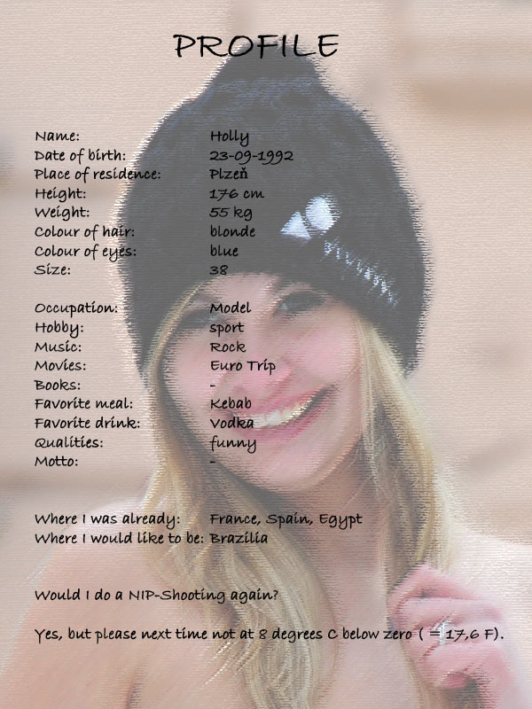 Die letzte Serie drehten wir noch einmal an der Moldau wo Holly der kalte Wind ins Gesicht blies. Sie erzählte mir dass es ihr trotz Kälte sehr viel Spass gemacht hat und sie gerne im Sommer mit uns noch einmal was machen möchte.