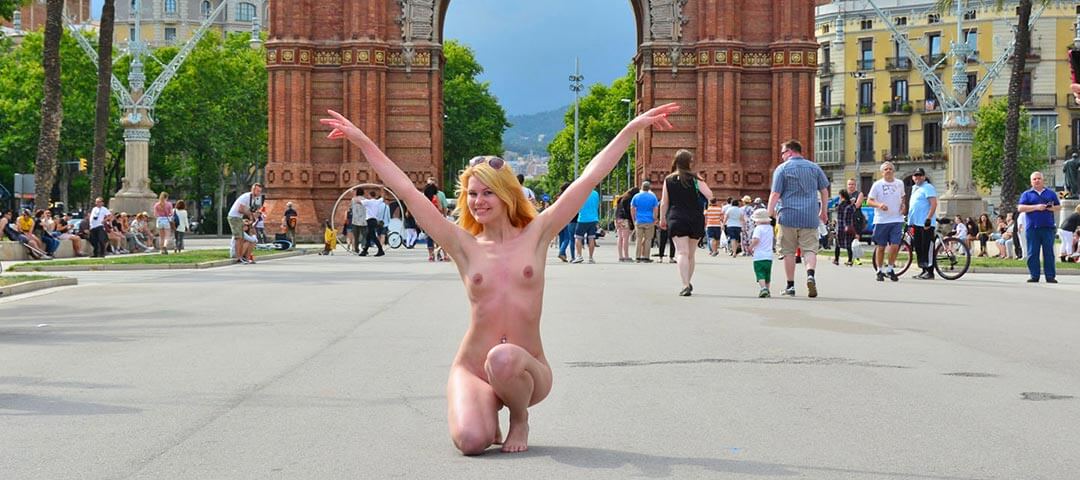 Izzy haben wir mit nach Barcelona genommen weil sie sehr viel Spass beim letzten NIP Shooting hatte und auch so ein angenehmer Mensch ist. Mit ihr sind wir am Morgen nach Sitges gefahren weil wir vom letzten mal wußten dass es in der Stadt Spass macht zu arbeiten. Das war auch diesmal so. Zumindest am Anfang. Wir starteten an der Strandpromenade und Izzy schlenderte ganz gemütlich zwischen den anderen Passanten umher und fühlte sich sichtlich wohl. Ein paar Strandverkäufer machten Fotos oder riefen ihr einen netten Spruch hinterher. Dann fuhr ein Polizeiauto vorbei und wir stoppten kurz. Als es weg war ging es weiter aber nach ein paar Minuten mussten wir stoppen da das Auto gedreht hatte und die Polizei ruck zuck bei uns war. Relativ freundlich baten sie uns aufzuhören. Ohne Genehmigung wäre es nicht möglich an diesem Tag weiter zu machen. Sie erzählten uns sogar wo wir hingehen sollten um eine Genehmigung zu bekommen aber wer jetzt denket das so etwas einfach funktioniert, der glaubt auch das die Erde eine Scheibe ist. 🙂 Nach etlichen Stunden beim Amt gaben wir es auf und fuhren leicht verärgert zurück nach Barcelona. Das Wetter verschlechterte sich auch und wir sahen irgendwie kein Licht am Horizont. Jetzt mussten wir etwas unternehmen so dass wir nicht auch noch im Gewitter stehen mussten. Wir suchten uns eine Location mit ein paar guten Stellen um das Shooting weiter machen zu können. Erst ging es zum Arc de Triomf wo Izzy schön langsam die Promenade entlang lief. Sie macht viele Bilder mit anderen Touristen und auch die Spanier waren an diesem Tag richtig gut gelaunt. Danach überquerten wir nur eine große Strasse um gleich weite machen zu können da das Wetter sichtlich schlechter wurde. Hier hatte sie einigen Kontakt zu einer Gruppe Fahrradfahrer. Sie baten Izzy dass sie auch mal mit einem Rad fahren soll und machten fleißig Bilder. Und da Izzy gerne redete wurden dann sogar Gespräche geführt um den Menschen zu erklären warum sie das macht. Dann ging es weiter in den Park wo sich auf einmal eine andere Frau auszog und dann mit Izzy redete. Irgendwie war das eine ganz lustige Situation die ganz viele Passanten erstaunen ließ. Wir setzen dann die Runde weiter fort, mussten dann aber wetterbedingt aufhören. Trotz des ganzen Stress haben wir doch noch richtig schöne Aufnahmen zusammen bekommen und konnten zurück zu unserer Finca fahren wo wir alle zusammen den Abend gefeiert haben.