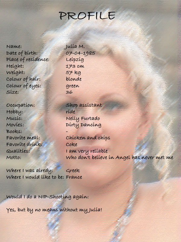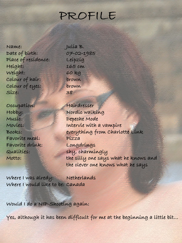 it der „blonden“ Julia standen wir schon lange in Kontakt – sie wollte gerne Aufnahmen mit uns machen – aber auf gar keinen Fall alleine! Julia konnte irgendwann ihre gleichnamige Freundin Julia zum Shooting überreden. Aufnahmen an sehr belebten Orten oder womöglich Innenstadtaufnahmen standen die beiden Julias skeptisch gegenüber. Also wurde mit beiden ein kurzes Probeshooting im „Grünen“ vereinbart. Für etwa 10 Minuten sollten die beiden ihren Mut zusammenfassen und sich nackt vor der Kamera zeigen.