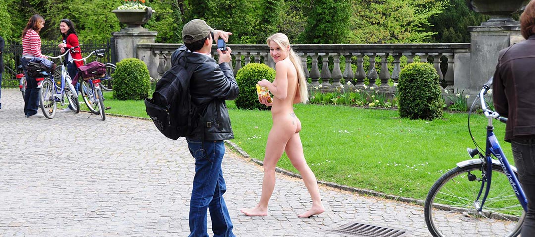 Witzigerweise entdeckten wir hier in der Parkanlage auch einen der Passanten, der am Tag zuvor unser Model in Berlin unaufhörlich verfolgt und fotografiert hat. Er muss wohl auch gedacht haben: Oh wie schön – in Deutschland laufen die Mädels immer nackt rum!