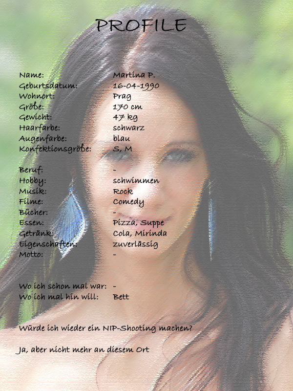 Martina hat das Shooting Spass gemacht obwohl sie am Anfang ein wenig Angst hatte. Sie würde es auch noch einmal machen aber nicht wieder in Prag da sie da alle Kommentare verstanden hat. Besser in einem anderen Land.