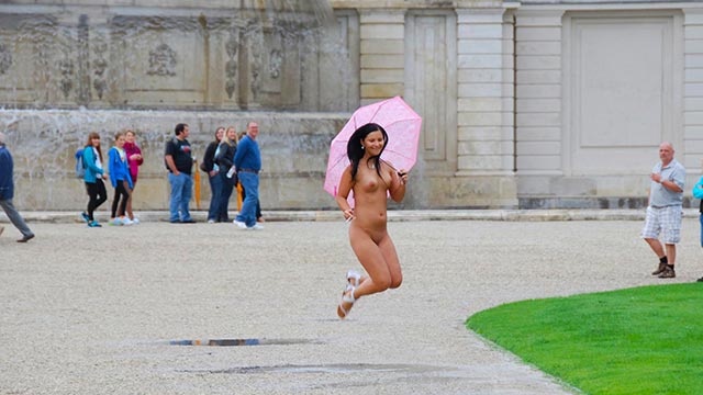 Wir fingen im Park Schönbrunn an und hier hielt sich der Regen noch in Grenzen. Es war auch richtig kalt geworden so dass Petra uns anflehte mit Schuhen laufen zu dürfen. Klar kein Problem, hauptsache ihre gute Laune blieb uns erhalten. Kaum war sie nackt platschte sie durch die Pfützen und rannte durch den Park als ob ihr das alles gar nichts ausmachen würde. Sie meinte am Anfang schon dass sie recht nervös sei aber das sah man ihr so überhaupt nicht an. Hier im Park hielten wir uns recht lange auf aber irgendwann mussten wir mal wechseln weil wir mehr Leute haben wollten.