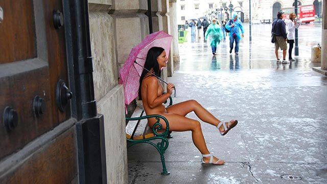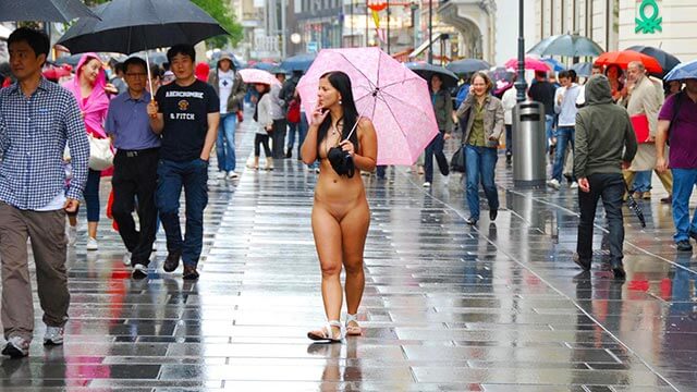Wir gingen in die sehr volle Einkaufsstrasse und hier ging Petra auch wieder richtig ab. Sie posierte, sprang durch die Pfützen unterhielt sich mit den Passanten. Das war alles gar nicht so einfach weil es immer mehr regnete und alle inklusive uns einen Schirm hatten. In einer Hand der Schirm und die Sachen von Petra, in der anderen Hand die Kamera. Und dann mussten wir uns noch Platz machen um alles aufs Bild zu bekommen. 🙂 Nach vielen Selfies mit den Passanten stoppten wir und gingen für die letzte Serie zur Hofburg. Hier waren auch noch ein paar Passanten unterwegs die sich über unser nacktes Model sehr freuten. Auf dem Video kann man auch schön hören wie stark es regnete und Petras Laune wurde auch immer schlechter da sie mittlerweile durchgefroren war. Sie hielt aber noch für einige Minuten durch und beendete unser Shooting mit einem Lächeln im Gesicht. Auf die Frage ob es ihr gefallen hat kam ein deutliches JA, aber wieder machen würde sie es nur bei richtig schönem Wetter. Das kann ich gut verstehen. 🙂