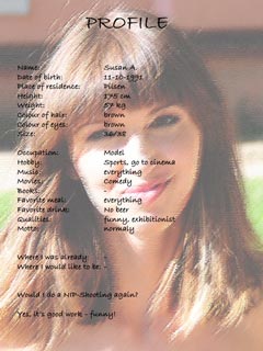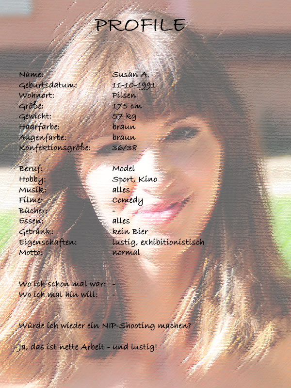 Als die Model-Agentur uns Susan als Model vorschlug, waren wir etwas verunsichert. Auf den Fotos schaute sie aus wie eine Klosterschülerin: jung, unschuldig und total brav. Meistens sind wir dann doch immer positiv überrascht worden (unscheinbar und durchschnittlich aussehend in der Model-Kartei und in Wirklichkeit stand dann ein „Sahneschnittchen“ vor uns) . Und es war auch dieses mal wieder so! Susan kam zwar aus einer katholischen Familie (Zitat: „Meine Familie darf das auf gar keinen Fall wissen dass ich nackt durch Prag laufe!“), war aber sehr freizügig und total aufgeschlossen.