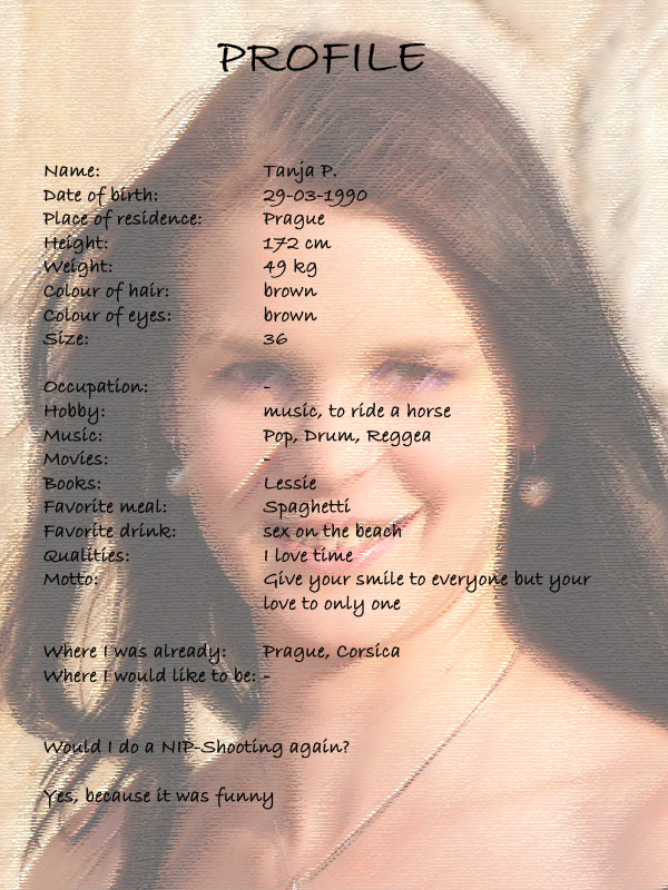 Tanja trafen wir am frühen Abend in Prag. Wir erklärten ihr kurz den Shooting-Ablauf und da die Zeit drängte, legten wir auch sofort los. Wir begannen mit den Aufnahmen am Moldau-Ufer. Tanja war ein bißchen aufgeregt, lies es sich aber nicht großartig anmerken.