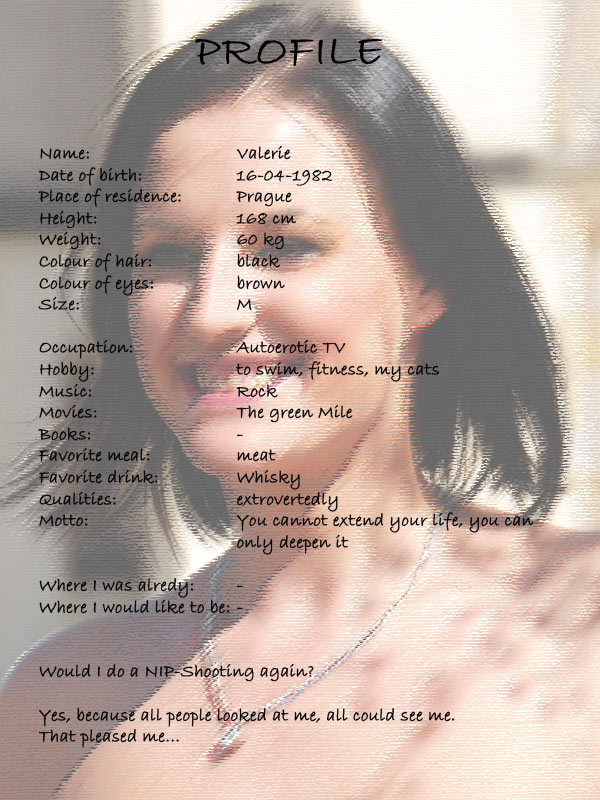 Die Aufnahmen wollte sie nicht in Prag machen. So fuhren wir in den in der Nähe gelegenen Ort Kladno. Vor Shootingbeginn sahen wir schon Polizei in der Fußgängerzone. Also – kein großartiges Risiko eingehen… Ein paar Seitenstraßen weiter hatten wir dann Glück. Valerie war alles andere als Kamerascheu. Sie verstand es mit der Kamera zu flirten und sich entsprechend in Pose zu setzen. Das eine oder andere mal mussten wir sie bremsen – sie zeigte sich an manchen Stellen etwas zu freizügig. Sie erklärte uns, dass sie mit „Freizügigkeit“ kein Problem hätte. Sie verdiente sich mit Auto-Erotischen-Aufnahmen im Fernsehen ihr Geld…