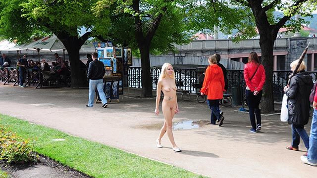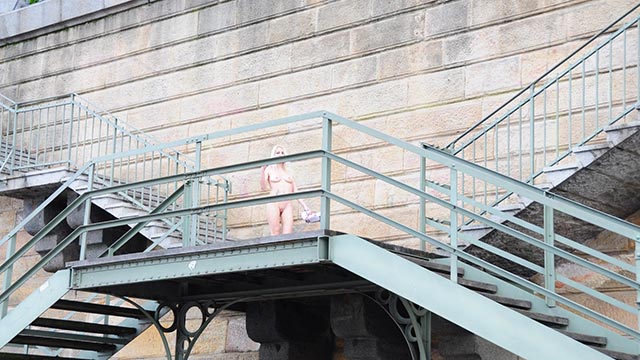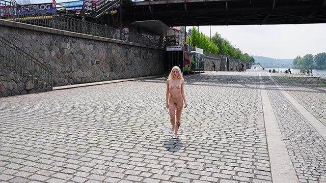 Mit Vanessa haben wir uns in Prag getroffen. Da sie ein wenig Angst hatte begannen wir das Shooting etwas ruhiger auf einer Eisenbahnbrücke wo nicht ganz so viele Leute waren. Nach dem Interview ging es los und Vanessa zog sich aus. Sie schlenderte die Brücke entlang um von da aus langsam zur Hauptstrasse zu gelangen. Irgendwie waren aber an diesem Tag sehr viele Polizeiautos unterwegs und wir stoppten die erste Serie da von weiten das erste Auto schon zu sehen war. Wir gingen dann ein paar Meter weiter um am Moldau Ufer weiter zu machen. Komischerweise fuhr dann aber schon wieder die Polizei vorbei und wir mussten nach knapp 2 Minuten aufhören. Als wir dann weiter wollten, wurden wir noch von der Polizei angehalten und mussten erklären was wir da gemacht haben. Mist – das lief aber nicht so gut an dem Tag.