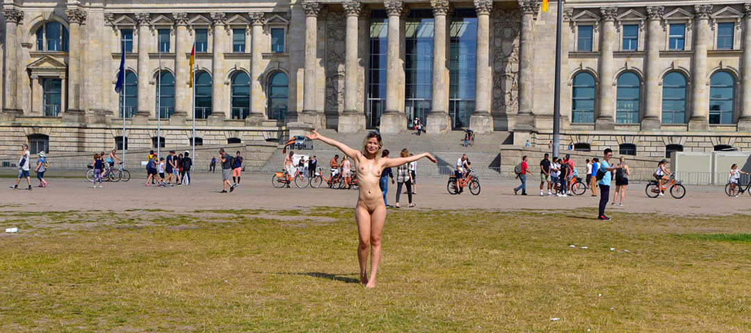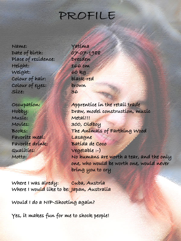 Gestartet haben wir am Terrassenufer. Es war Sonntag, die Passanten waren gut gelaunt und Yatima ließ sich bereitwillig von diesen fotografieren. Yatima war nicht sehr aufgeregt. Es war ihr erstes NIP-Shooting, aber das merkte man ihr nicht an. Sie hatte sichtlich Spaß dabei, während des Shootings die Blicke und Reaktionen der Passanten zu beobachten. Als sie nach der ersten Serie (angezogen) zum nächsten Drehort ging, teilte sie mir mit: >Das macht mir richtig viel Spaß! Ich war auch gerade richtig unartig und habe meinen Rock gehoben. Du hättest mal das Gesicht des Passanten sehen sollen< Hoppla…..