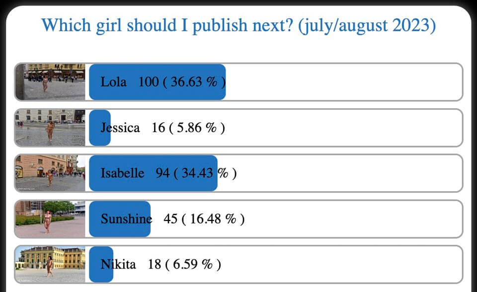 June 15, 2023 Mathias news 2 Comments Which girl should I publish next? (july/august 2023) Voting ends 2023-07-04 Related Posts Next Girl – Emma 2nd Shooting Next Model: Emma Release Date: November 2025 Location: Vienna Duration: 60 Minutes Next Girl – Alex Next Model: Alex Release Date: October 2025 Location: Berlin Duration: 49 Minutes Next Girl – Norah Next Model: Norah Release Date: September 2025 Location: Frankfurt Duration: 45 Minutes Subscribe Notify of new follow-up comments new replies to my comments I allow to use my email address and send notification about new comments and replies (you can unsubscribe at any time). Label {} [+] Name* Email Label {} [+] Name* Email 2 Comments Oldest Newest Most Voted Inline Feedbacks View all comments Steve 2 years ago Looks like it’s going to be a close one this month. Fingers crossed for Isabelle. Jeeersh 2 years ago I can’t believe Sunshine keeps getting passed up. I’d kill to see her content!